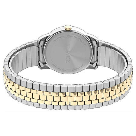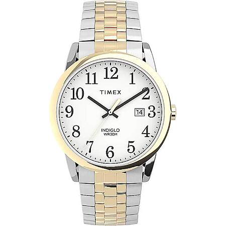 Timex TW2V40100 men's Easy Reader white dial bracelet quartz watch is offered, in a two tone yellow gold plated solid stainless steel case. This watch measures 38mm across and 9mm thick. This watch has a fixed bezel and a textured push/pull main crown. Timex TW2V40100 is fitted with a two tone yellow gold plated stainless steel bracelet. Securing the bracelet is a expansion band made in stainless steel.