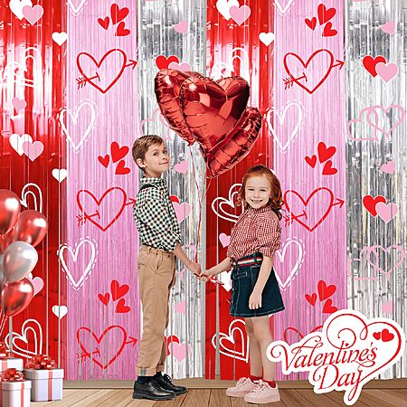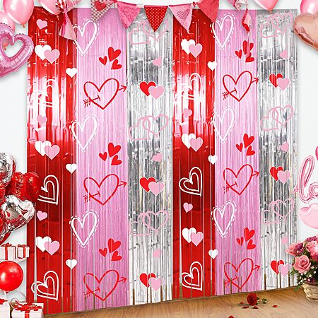 Foil Fringe Curtains Backdrop Valentines Party Decorations, 2 Pack 3.3 x 6.6 FT Red Pink Silver Tinsel Valentines Day Backdrop - $7.49,