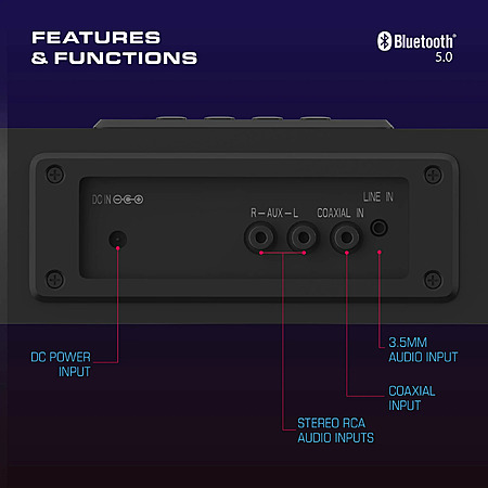 • Connects wirelessly via Bluetooth, or through AUX, Line-in, and Coaxial audio inputs