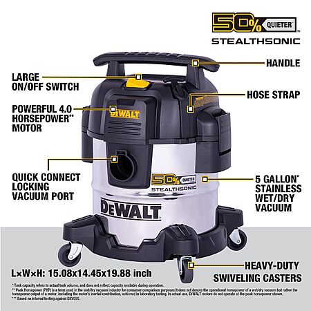 ToolDirect via Amazon.com has DEWALT 5 Gallon STEALTHSONIC Shop Vacuum Wet and Dry, Powerful Suction & Portable Shop Vac with Attachments, Ultra Quiet Wet Dry Vacuum for Home, Garage, Car, Workshop, Jobsite, DXV05S-QT, 4 Peak HP on sale for $116. Shipping is Free.