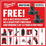 Way Source offers 2-Pack 3.0 Ah Milwaukee M12 REDLITHIUM XC 3.0 High Capacity Batteries (48-11-2412) + 1x Select Milwaukee Bare Tool for $149. Shipping is free.