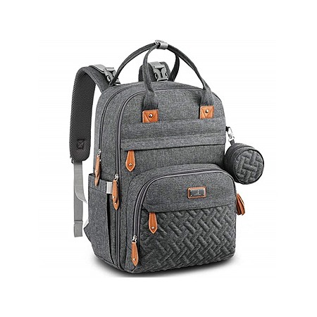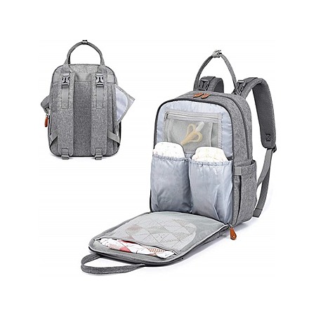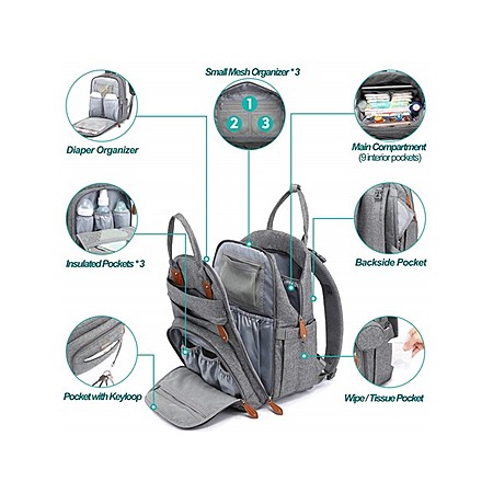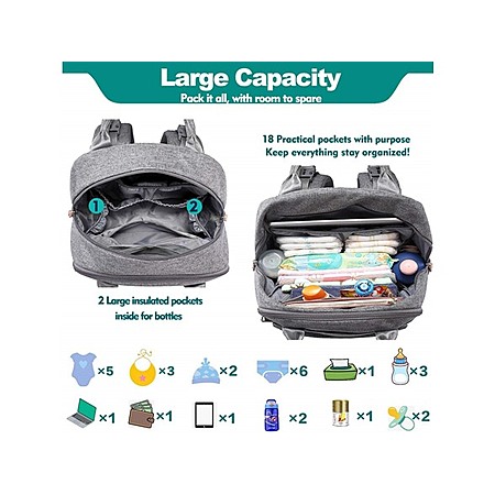 - Large Storage Capacity: 2 main compartments, 5 insulated bottle pockets (fits all major baby bottles), wipe pocket, and a dedicated changing pad compartment