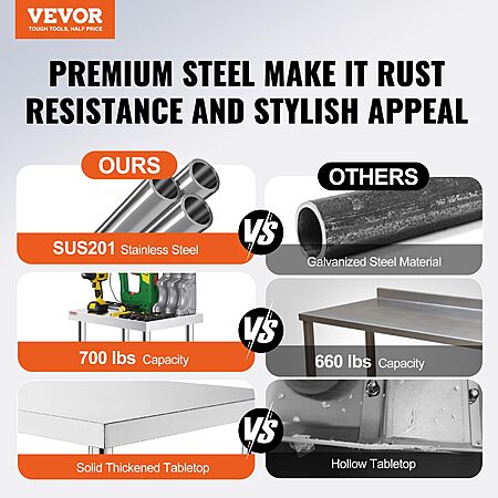 - Rock Solid Material: Material: stainless steel; Tube Diameter: 1.9 in; Upper layer thickness: 2.2 in; Lower layer thickness: 1.8 in. Our kitchen prep table is constructed of stainless steel, with surface drawing treatment, offering excellent corrosion resistance, durability, ease of cleaning. In addition, this work table provides you with a large workspace, so you don't have to overcrowd your countertops.