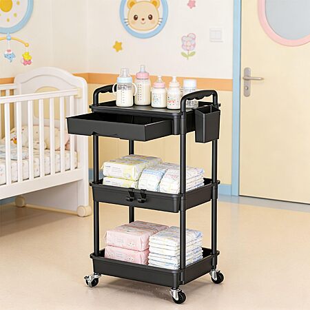 3 Tier Rolling Storage Carts with Removable Drawers, Lockable Wheels, Hooks & Cup Holders – Easy Assembly Storage Organizer PRIME ONLY $20