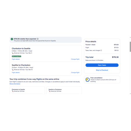 American Airlines and Expedia have round trip airfares travelling to and from Charleston SC (CHS) and Seattle (SEA) for $179, making 1 stop both ways and change planes in Charlotte. These are basic economy fares that allow a personal item and a carry-on bag. There is no seat selection and no change. If you are travelling with children, you will be seated together as per their policy.
