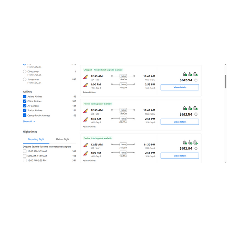 Asiana Airlines via Booking.com have round trip airfares travelling from Seattle (SEA) to Hong Kong (HKG) for $613, making 1 stop Seoul Korea for varying number of hours both ways. Stopover duration depends on the flight you choose. These are economy fares that allow a personal item, a carry-on bag and 2 free checked bags. My screenshot is showing 3 different flight options for the same airfare, on the same dates.