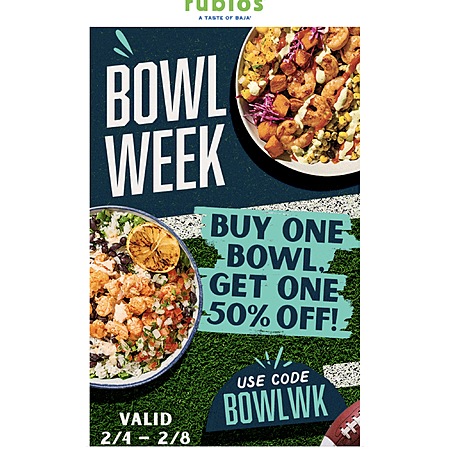 From 2/4 - 2/8/2026, buy one burrito bowl or salad and get your second one 50% off with code BOWLWK. Must use code to get offer. Does not include tax and gratuites. No subsitutions. One qualifying bowl will be discounted per check. Additional restrictions may apply, see store for details. Manager reserves all rights