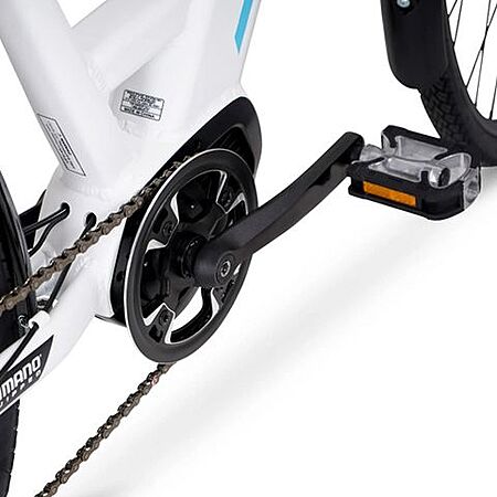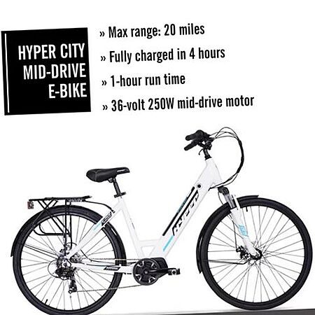 The 36v 700c Matte White E-Ride Mid-Drive, Adult electric bike from Hyper is perfect for commuting and completing errands around town. Enjoy the benefits of cycling with assistance from the electric motor. The E-Ride electric bike has a higher initial and continuous torque, a more responsive pedal-assist system, and a balanced center of gravity for better maneuvering. This makes it easier to climb steeper hills for a longer duration. Includes a handlebar-mounted controller with a digital display. This e-bike offers a 7-speed.