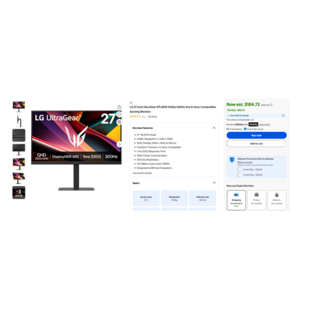 | Product Description: | LG27G640AB LG 27 Inch UltraGear IPS QHD 1440p 300Hz 1ms G-Sync Compatible Gaming Monitor Power Cable HDMI 2.1 Cable DisplayPort Cable LG 1 Year Limited Warranty LG 27 Inch UltraGear Gaming Monitor Product Highlight 27" QHD IPS display delivers sharp detail, rich color, and wide viewing angles An ultra-smooth 300Hz refresh rate and 1ms response keeps fast-paced gameplay sharp and fluid Up to 95% DCI-P3 color and VESA HDR400 bring games to life in stunning detail Seamless frame sync with FreeSync™ Premium and G-Sync® Compatibility for stutter-free gaming Narrow-bezel, "L" designed stand with height, tilt, swivel and pivot adjustments Built-in speakers provide deep, powerful sound that elevate gameplay Product Feature Blazing Speed. Brilliant Color. Total Control. Dominate the game with a 27" QHD IPS display built for speed, clarity, and precision. Enjoy ultra-smooth action with 300Hz/1ms (GtG), vibrant HDR visuals, and tear-free gameplay—plus pro-level adjustments and versatile ports for your perfect setup. 27" QHD IPS Clarity Enjoy crisp, detailed visuals with QHD (2560x1440) resolution on a vibrant 27" IPS display. Wide viewing angles keep colors vivid from any position, so every scene stays crisp and vibrant. 300Hz Refresh Rate for the Win React faster and play smoother with a blistering 300Hz refresh rate—perfect for high-speed competitive gaming where every millisecond counts. Experience fluid motion and razor-sharp clarity, even in the most intense action. 1ms (GtG): Astounding Gaming Speed Play with a near-instantaneous 1ms response time, which minimizes ghosting for gaming visuals that are sharp, clear and buttery smooth. Vivid Color and HDR Brilliance Immerse yourself in lifelike visuals with up to 95% DCI-P3 color gamut and VESA DisplayHDR™ 400. Enjoy rich hues, bright highlights, and deep dark shadows that make every game more vibrant and every scene more cinematic. Ultimate Frame Sync: FreeSync™ Premium & G-SYNC® Compatible Say goodbye to screen tearing and stutter. With AMD FreeSync™ Premium and NVIDIA® G-SYNC® compatibility, this UltraGear™ monitor delivers ultra-smooth, tear-free visuals, giving you perfect frame sync across PC and next-gen console gaming. Seamless Display, and Adjustable to Gamer Specs Dive into gameplay on the narrow-bezeled 27” screen. The slim-profile display has adjustable height, tilt, swivel and pivot controls that let you customize your view. Serious Connectivity for Serious Gamers Connect your way with USB Type-C (15W power delivery), dual HDMI 2.1 ports, and DisplayPort 1.4. Enjoy smoother gameplay, vivid colors, and high-resolution graphics—plus the convenience of powering devices while you play or work. Unlock Your Potential with Advanced Gaming Features Dynamic Action Sync ... 27" 16:9 IPS Panel HDMI | DisplayPort | USB-C (15W) QHD (1440p) 2560 x 1440 at 300 Hz FreeSync Premium | G-Sync Compatible 1 ms (GtG) Response Time 1300:1 Static Contrast Ratio 300 nits Brightness 1.07 Billion Colors with HDR10 Integrated USB Hub & Speakers |