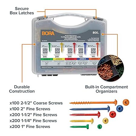 $64.99 | Bora 800 Pocket Hole Screws Assortment Kit Self Tapping Fine/Coarse Thread Color Coated Wood Screws at Amazon