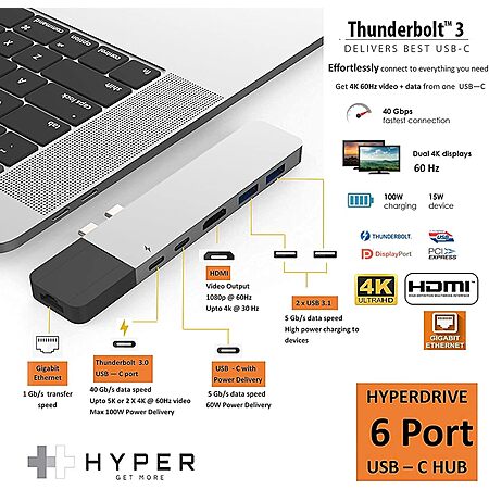 HyperDrive USB C Hub, NET 6-in-2 for MacBook Pro Air, Multi-Port USB-C Dongle w/Gigabit Ethernet, 40Gbps/100W PD, 5Gbps/60W PD, 4K30Hz HDMI $11.99 at Woot via Amazon