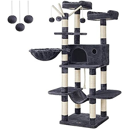 Model: FEANDREA Cat Tree, Large Cat Tower, 64.6 Inches, Cat Activity Center with Hammock, Basket, Removable Fur Ball Sticks, Cat Condo, Smoky Gray UPCT087G01