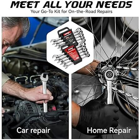 Each wrench features both open end and box end designs with a 72-tooth ratcheting mechanism that requires only 5 degrees of swing arc, making them perfect for tight spaces.
