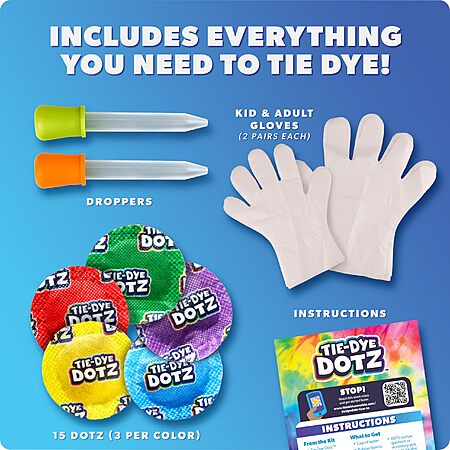 - COMPLETE CRAFT KIT – Includes 15 Dotz in 5 vibrant colors, 2 droppers, 2 pairs of adult and 2 pairs of child gloves, and printed and video instructions that walk you through the process. Rubber bands are not included but can enhance certain designs. JUST ADD WATER – Place Dotz on garments or accessories (sold separately), add water with the droppers, and watch the tie dye magic happen--it's that easy!