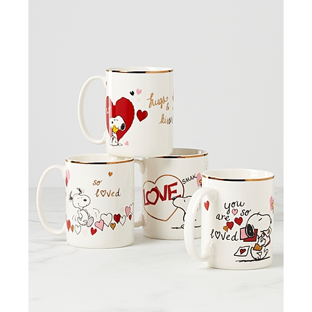 Serve up tea, cocoa or coffee and warm fuzzy kisses with this set from Lenox, four porcelain Snoopy mugs with sleek gold trim.