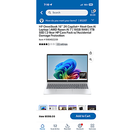 HP OmniBook 16" 2K Copilot+ Next Gen AI Laptop | AMD Ryzen AI 7 | 16GB RAM | 1TB SSD | 2-Year HP Care Pack w/Accidental Damage Protection $599