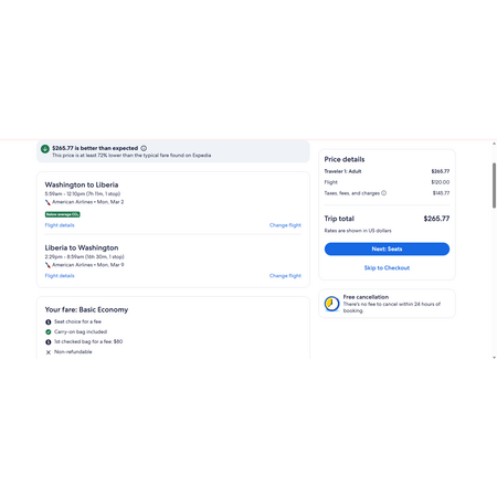 American Airlines and Expedia have round trip airfares travelling from Washington DC (DCA) to Liberia Costa Rica (LIR) for $266, making 1 stop. These are basic economy fares, a restricted-type fare that allows a personal item and a carry-on bag. There is no seat selection and no changes. If you are travelling with children, you will be seated together as per AA's policy.