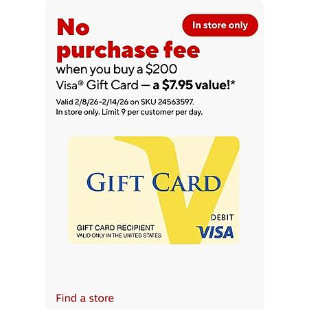 At Staples - No Purchase Fee when you buy a $200 VISA Gift Card In Store Only (a $7.95 value) - Starts from 2/8-2/14 - Limit 9 per customer per day