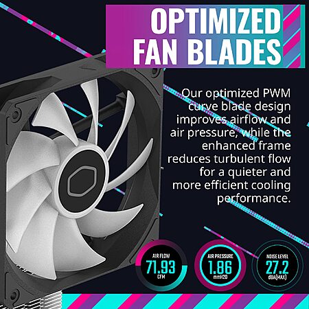 • Optimized Fan Blades: Our optimized PWM curve blade design improves airflow and air pressure, while the enhanced frame reduces turbulent flow for a quieter and more efficient cooling performance.