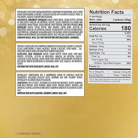 - ASSORTED TREATS: Indulge in the original hazelnut milk chocolate Ferrero Rocher, creamy coconut Raffaello and rich dark chocolate Rondnoir