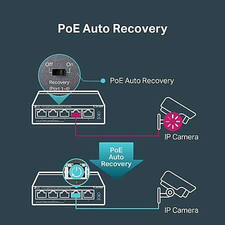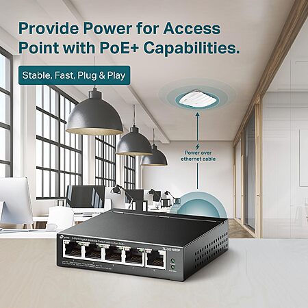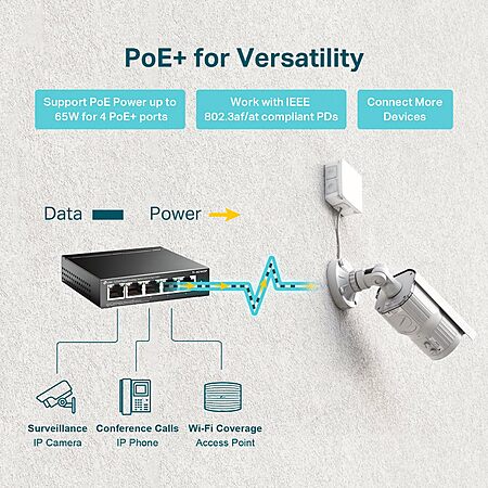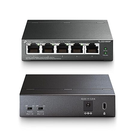 https://www.amazon.com/l/17985366...B076HZFY3F- [Flexible Full Gigabit 5-Port PoE Configuration] 4x PoE+ (802.3at/af) 10/100/1000 Mbps RJ45 ports providing up to 30W per port and total PoE power budget of 65W, together w/ 1x Gigabit Non-PoE Port for high-speed connections.
