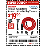 Harbor Freight [Store Locator] is offering Harbor Freight Super Coupon: BAUER Premium Auto Detailing Accessory Kit for Wet/Dry Vacuums [Details] on sale for $29.99 - Extra 33% Off ($10) w/ coupon code 25044553 (apply in cart or at checkout) = $19.99. Valid for in-store or online purchase. Purchase in-stores to save on shipping fees, otherwise, a flat-rate $8.99 shipping/handling fee will apply.