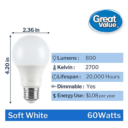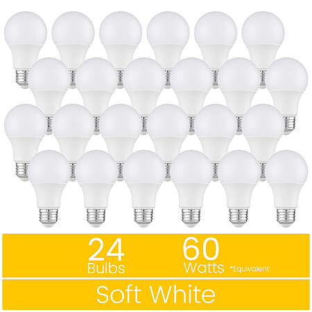 Walmart brand Great Value 18YR A19 LED Bulb, 9-Watt (60W Equivalent) E26 Base, Dimmable, Soft White, 24-Pack $23.97