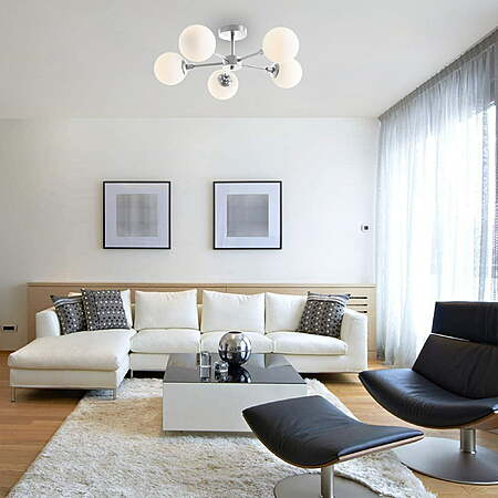 - Frosted Globe Shades: Features five frosted globe glass shades on branching arms for a stylish look.
