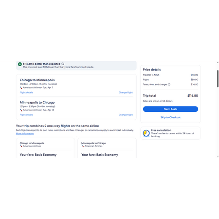 American Airlines and Expedia have round trip airfares travelling to and from Chicago (ORD) and Minneapolis (MSP) for $117, nonstop. These are basic economy fares that allow a personal item and a carry-on bag. There is no seat selection and no change. If you are travelling with children, you will be seated together as per AA's policy.