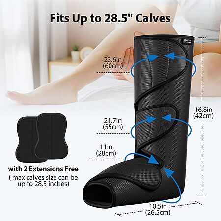 - The adjustable Velcro leg wraps fit calves up to 22 inches, and 2 included extensions expand coverage up to 28.5 inches—perfect for sharing between family members. Lightweight and portable, it fits neatly in your bag so you can enjoy relaxing compression at home, in the office, or while traveling