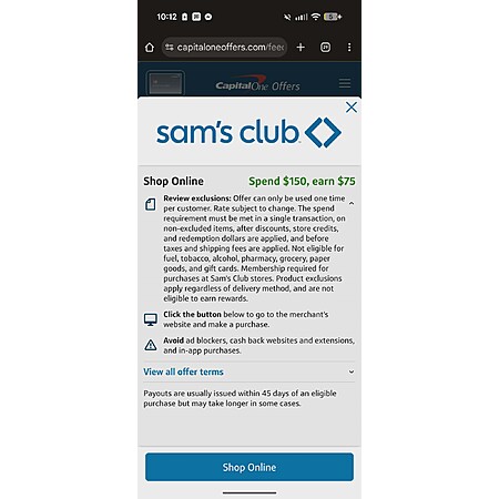 Yesterday, I logged in to my account and saw offers for $125 cash back on $250 for Sam's Club and $25 cash back on $100 for Walmart. It took me a while to find something worth buying and when I was ready to checkout, my capitalone logged out and I had to relog in again, but unfortunately, the offers were gone for both Sams and Walmart.