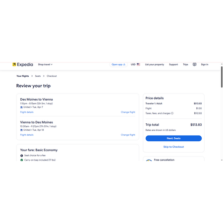 United Airlines and Expedia have round trip airfares travelling from Des Moines IA (DSM) to Vienna Austria (VIE) for $514, making 1 stop both ways. There are a couple of flights to choose from so your stopover duration depends on the flight you choose. My screen shot shows 1 hour in Denver on outbound, and a little over 6 hours on return so plan ahead and get a club pass or something. These are basic economy fares that allow a personal item and a carry-on bag. There is no seat selection and no change.