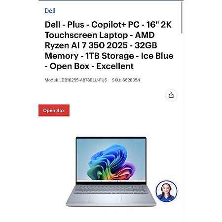 Dell Plus CoPilot 16" 2K Touchscreen, AMD Ryzen AI 7 350, 32GB, 1TB, Open Box $668.99
