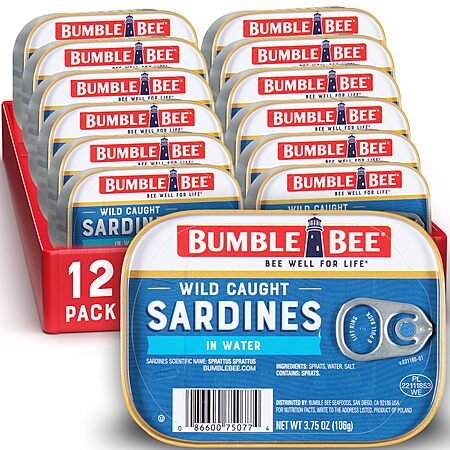 Bumble Bee Sardines in Water, Mustard Or Oil, 3.75 oz Tin (Pack of 12) - Wild Caught, Gluten Free, Keto, Kosher, Clean Ingredients~$10.26 After Coupon & S&S @ Amazon