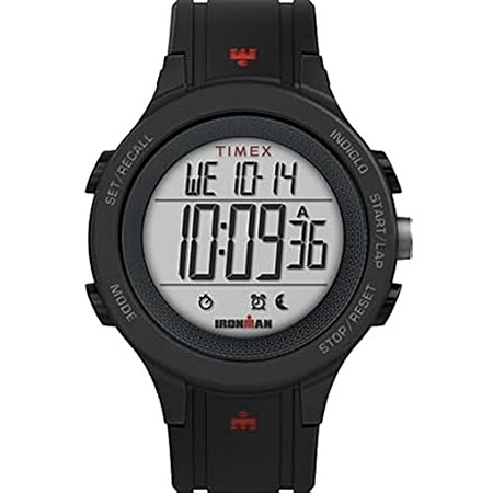 - Black 42mm resin case with black top ring & acrylic lens; positive digital display; Indiglo light-up watch dial