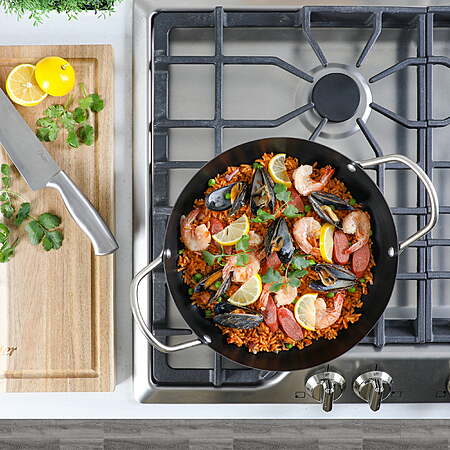 • NONSTICK INTERIOR: Often loaded with a variety of ingredients, the traditional paella recipe requires a nonstick pan to release and serve crisp rice socarrat and portions of vibrant vegetables and aromatic spice blends.