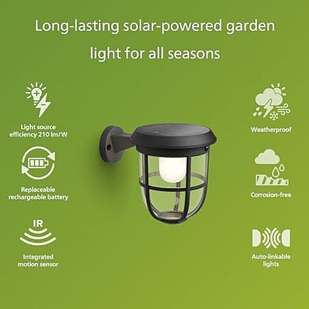 Model: Philips Solar LED 1-Pack Ultra-Efficient Wall Lantern - Radii, Dusk to Dawn, Automatically Linkable, Daylight and Motion Sensor, 3000K Bright White Light, IP44, Black