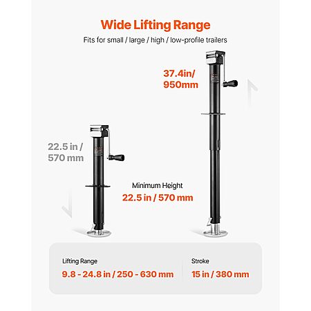 - Heavy-Duty Load Capacity: The VEVOR Electric Trailer Jack boasts an impressive lifting capacity of 5000 lbs, making it a powerful tool for lifting tasks. With a lifting range of 9.65 to 24.64 inches, it fits for no matter high-profile or low-profile trailers.