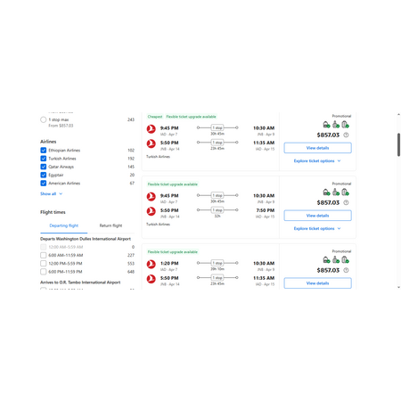 Turkish Airlines via Booking.com have round trip airfares travelling from Washington DC (IAD) to Johannesburg South Africa (JNB) for $857, making 1 stop in Istanbul Turkey for 2-24 hours depending on the flight you choose. There are several flights to choose from. These are economy fares that allow a personal item, a carry-on bag and 2 free checked bags.