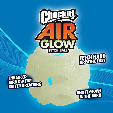 - Air Glow Fetch Ball Dog Toy: These high-performance balls are designed for extended play sessions! They combine the hollow, mesh-like design of the Air ball to help facilitate breathing and airflow to your dog's lungs while running and fetching, with the glow of our Max Glow ball to extend play time even after sunset! Air Glow allows dogs to fetch hard, breathe easy!
