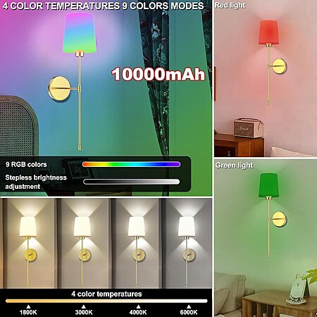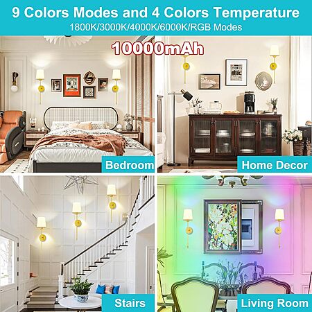 - Versatile RGB Dimmable Ambience Lights: These battery-operated wall lights act like lighting chameleons. They offer 4 adjustable color temperatures and 9 vibrant RGB colors to match your mood or decor. Craft the perfect atmosphere for cozy evenings or lively gatherings, with 4 brightness levels to adapt from soft glows to bright light