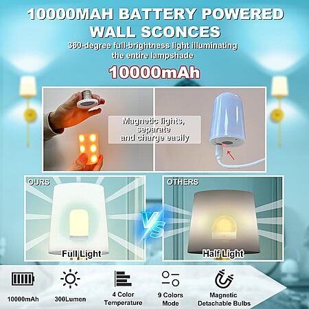 - 10000mAh Rechargeable Magnetic Bulbs: These wall sconces with white fabric shades offer ideal indoor lighting. Their rechargeable RGB dimmable bulbs provide versatile light. Built-in magnets let you remove bulbs easily to charge via USB—no disposable batteries, eco-friendly and cost-saving. Long-lasting battery delivers 30-80 hours per charge, cutting electricity costs and avoiding frequent swaps
