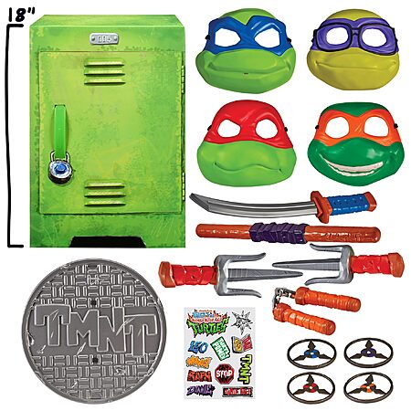- Ready To Role: The Team Turtle Roleplay Locker set includes 1 locker package, 4 Turtle masks, 1 katana, 1 nunchaku, 2 sai, 1 bo staff, 1 sewer lid shield, 4 ninja stars, and 1 sticker sheet