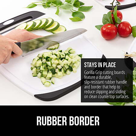 • REVERSIBLE DESIGN WITH DEEP JUICE GROOVES: each Gorilla Grip Cutting Board features a reversible design that allows you to chop on both sides to help prevent flavor mingling; boards also feature deep juice grooves on one side to help prevent countertop mess by catching runoff juices