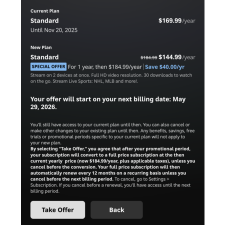 If you currently have a subscription, go ahead to your "subscription" page and cancel. You might receive an offer to continue for $145 for the next year.