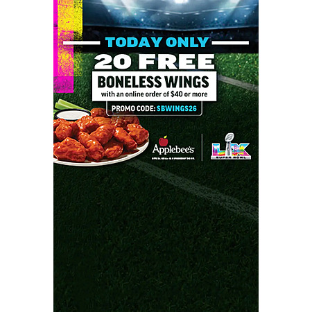 - 20 Boneless Wings Free with a $40 online order w/ promo code SBWINGS26
