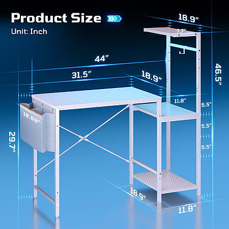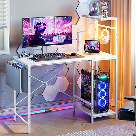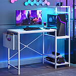 Model: Bestier Gaming Desk with LED Lights, 44'' Computer Desk with Reversible Shelves, PC Gamer Desk with Side Storage Bag, Hooks and Height Adjustable Shelf for Home Office, White
