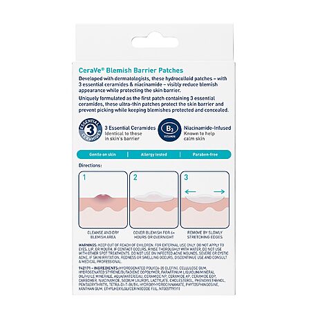 - 10 Patches: 12 mm. 12 Patches: 10 mm. From the #1 dermatologist recommended Acne brand ( a). New. developed with dermatologists. Upon application: Reduces the appearance of blemishes & redness. Absorbs excess oil. Helps prevent picking to reduce risk of post-acne marks. Helps protect the skin barrier. With 3 essential ceramides & niacinamide. Suitable for sensitive skin. CeraVe Blemish Barrier Patches: Developed with dermatologists, these hydrocolloid patches - with 3 essential ceramides &