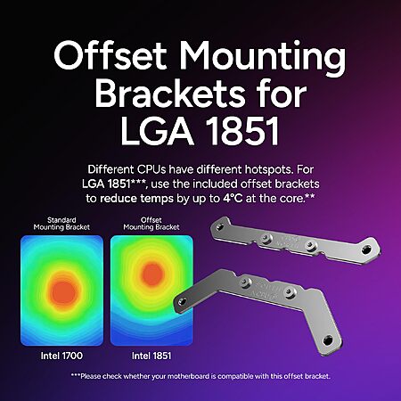 - Offset Brackets for LGA 1851: CPU hotspots vary. On LGA 1851, use the included offset brackets to lower core temperatures by up to 4°C.*