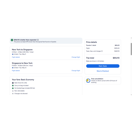 United Airlines and Expedia have round trip airfares travelling from New Jersey (EWR) to Singapore (SIN) for $817, making 1 stop in San Francisco both ways for 1-3 hours. These are basic economy fares that allow a personal item, a carry-on bag and 1 free checked bag. There is no seat selection and no change. If you are travelling with children, you will be seated together as per UA's policy.